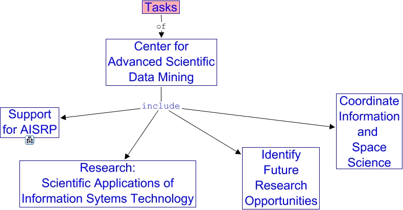 This Concept Map, created with IHMC CmapTools, has information related to: AISRP, Center for Advanced Scientific Data Mining include Research: Scientific Applications of Information Sytems Technology, Tasks of Center for Advanced Scientific Data Mining, Center for Advanced Scientific Data Mining include Coordinate Information and Space Science, Center for Advanced Scientific Data Mining include Identify Future Research Opportunities, Center for Advanced Scientific Data Mining include Support for AISRP