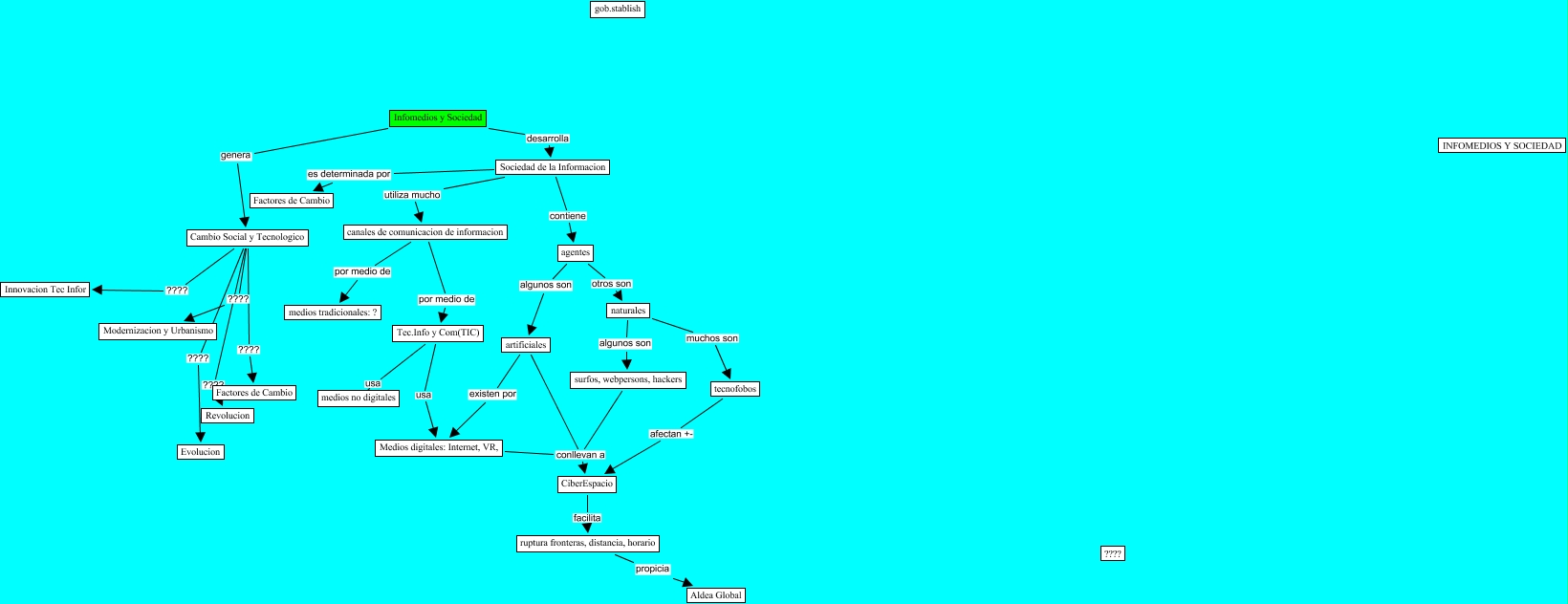 This Concept Map, created with IHMC CmapTools, has information related to: CiberSoc01f, Cambio Social y Tecnologico ???? Factores de Cambio, canales de comunicacion de informacion por medio de medios tradicionales: ?, Cambio Social y Tecnologico ???? Modernizacion y Urbanismo, naturales muchos son tecnofobos, Tec.Info y Com(TIC) usa Medios digitales: Internet, VR,, artificiales conllevan a CiberEspacio, Cambio Social y Tecnologico ???? Revolucion, canales de comunicacion de informacion por medio de Tec.Info y Com(TIC), Infomedios y Sociedad desarrolla Sociedad de la Informacion, Sociedad de la Informacion utiliza mucho canales de comunicacion de informacion, Sociedad de la Informacion contiene agentes, Cambio Social y Tecnologico ???? Evolucion, tecnofobos afectan +- CiberEspacio, agentes otros son naturales, Cambio Social y Tecnologico ???? Innovacion Tec Infor, Tec.Info y Com(TIC) usa medios no digitales, naturales algunos son surfos, webpersons, hackers, CiberEspacio facilita ruptura fronteras, distancia, horario, Medios digitales: Internet, VR, conllevan a CiberEspacio, Sociedad de la Informacion es determinada por Factores de Cambio