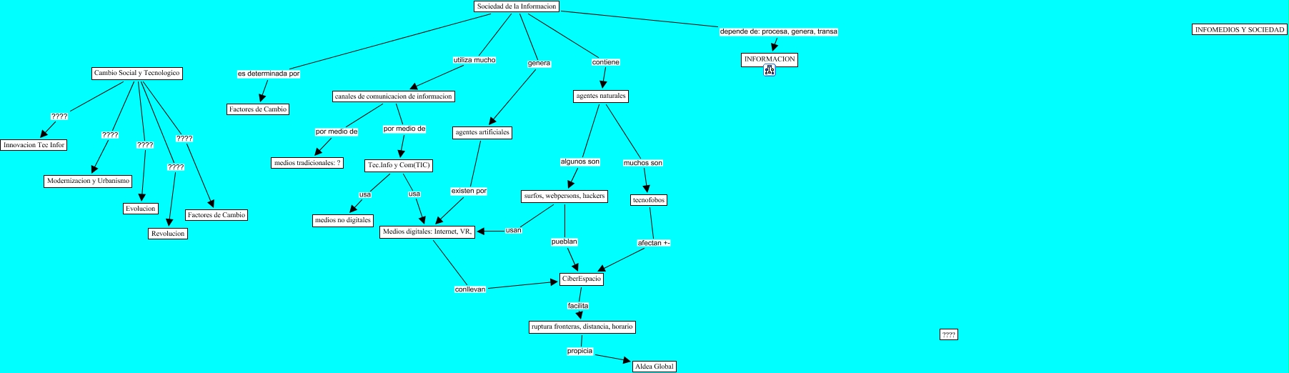 This Concept Map, created with IHMC CmapTools, has information related to: CiberSoc01j, canales de comunicacion de informacion por medio de medios tradicionales: ?, ruptura fronteras, distancia, horario propicia Aldea Global, Tec.Info y Com(TIC) usa Medios digitales: Internet, VR,, agentes artificiales existen por Medios digitales: Internet, VR,, agentes naturales muchos son tecnofobos, Tec.Info y Com(TIC) usa medios no digitales, Cambio Social y Tecnologico ???? Revolucion, Cambio Social y Tecnologico ???? Innovacion Tec Infor, CiberEspacio facilita ruptura fronteras, distancia, horario, tecnofobos afectan +- CiberEspacio, surfos, webpersons, hackers pueblan CiberEspacio, Sociedad de la Informacion es determinada por Factores de Cambio, Cambio Social y Tecnologico ???? Evolucion, Cambio Social y Tecnologico ???? Factores de Cambio, surfos, webpersons, hackers usan Medios digitales: Internet, VR,, Cambio Social y Tecnologico ???? Modernizacion y Urbanismo, Sociedad de la Informacion utiliza mucho canales de comunicacion de informacion, Sociedad de la Informacion genera agentes artificiales, agentes naturales algunos son surfos, webpersons, hackers, Medios digitales: Internet, VR, conllevan CiberEspacio
