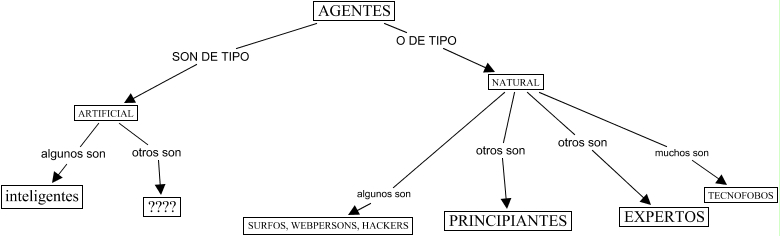This Concept Map, created with IHMC CmapTools, has information related to: agentes, ARTIFICIAL algunos son inteligentes, AGENTES SON DE TIPO ARTIFICIAL, ARTIFICIAL otros son ????, NATURAL otros son PRINCIPIANTES, NATURAL muchos son TECNOFOBOS, NATURAL algunos son SURFOS, WEBPERSONS, HACKERS, NATURAL otros son EXPERTOS, AGENTES O DE TIPO NATURAL