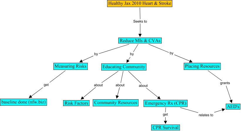 This Concept Map, created with IHMC CmapTools, has information related to: Healthy Jax 2010 CV, Reduce MIs & CVAs by Placing Resources, Reduce MIs & CVAs by Educating Community, Emergency Rx (CPR) relates to AED's, Educating Community about Community Resources, Reduce MIs & CVAs by Measuring Risks, Measuring Risks get baseline done (nfw.biz), Educating Community about Risk Factors, Emergency Rx (CPR) get CPR Survival, Healthy Jax 2010 Heart & Stroke Seeks to Reduce MIs & CVAs, Placing Resources grants AED's, Educating Community about Emergency Rx (CPR)