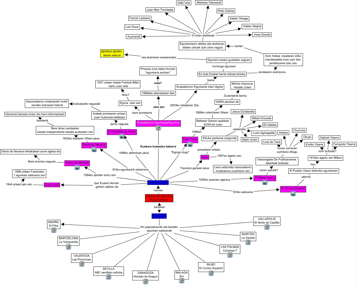 Este Cmap, tiene información relacionada con: Prentsa idatzia, Diario de Navarra 1903ko otailaren 25ean jaioa Bere lehen zenbakian kazeta independiente bezala aurkezten zen, 1990eko abenduaren 6an nola? Prozesu luze baten buruan "egunkaria sortzen", Bere lehen zenbakian kazeta independiente bezala aurkezten zen betidanik Garrantzi berezia eman dio herri-informazioari, Euskal Herrian Ipar Euskal Herrian gehien saltzen da Sud Ouest, Egunkariaren aldeko eta atxilotuen aldeko ohiuak izan ziren nagusi 10 ziren atxilotuak Juan Mari Torreladai, LAS PALMAS Canarias-7 Hiri populatuenak eta bertako egunkari salduenak MADRIL El PAis, Vascongada De Publicaciones elkarteak bultzata honen sorreran aurkituko ditugu Churruca, EAJko pertsona ezagunak esaterako Mitxel Unzueta, Euskal Herrian EHko egunkaririk zaharrena Diario de Navarra, EAJko pertsona ezagunak esaterako Jesus Duñabeitia, Ez dute Euskal herria ixiltzea lortuko Jendearen erantzuna Ezin hobea: otsailaren 22ko manifestaldia inoiz izan den jendetsuena izan zen, ZARAGOZA Heraldo de Aragon Hiri populatuenak eta bertako egunkari salduenak MADRIL El PAis, SEVILLA ABC sevillako edizioa Hiri populatuenak eta bertako egunkari salduenak MADRIL El PAis, BARTZELONA La Vanguardia Hiri populatuenak eta bertako egunkari salduenak MADRIL El PAis, PRENTSA IDATZIA EGUNKARIAK hemen Euskal Herrian, GARA jaiotzen da Zuzendaria berria Mertxe Aizpurua hautatu zuten, Vascongada De Publicaciones elkarteak bultzata honen sorreran aurkituko ditugu Olivan, Ezin hobea: otsailaren 22ko manifestaldia inoiz izan den jendetsuena izan zen bertan Egunkariaren aldeko eta atxilotuen aldeko ohiuak izan ziren nagusi, El Diario Vasco noren eskutik? Vascongada De Publicaciones elkarteak bultzata, MURTZIA La Verdad Hiri populatuenak eta bertako egunkari salduenak MADRIL El PAis