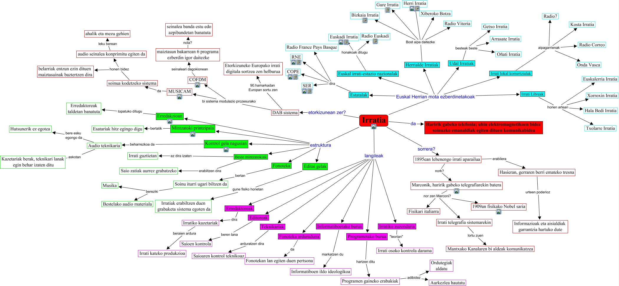 Este Cmap, tiene información relacionada con: Irratia, Irratia estruktura Mintzatoki printzipala, Beste mintzatokiak ez dira izaten Irrati guztietan, Teknikariak arduratzen dira Saioaren kontrol teknikoaz, Estatalak dira SER, Herrialde Irratiak Bost aipa daitezke Xiberoko Botza, Irratia Euskal Herrian mota ezberdinetakoak Herrialde Irratiak, Euskal irrati-estazio nazionalak honakoak ditugu Radio Euskadi, Irratia Euskal Herrian mota ezberdinetakoak Udal Irratiak, Fonoteka bertan Soinu iturri ugari biltzen da, DAB sistema 90.hamarkadan Europan sortu zen Etorkizuneko Europako irrati digitala sortzea zen helburua, Irrati telegrafia sistemarekin lortu zuen Mantxako Kanalaren bi aldeak komunikatzea, Udal Irratiak besteak beste Arrasate Irratia, Irratia Euskal Herrian mota ezberdinetakoak Euskal irrati-estazio nazionalak, Irratia langileak Editoreak, Irratia langileak Irratiko zuzendaria, Udal Irratiak besteak beste Getxo Irratia, Irratia Euskal Herrian mota ezberdinetakoak Estatalak, Programen gaineko erabakiak adibidez Aurkezlea hautatu, Irrati Libreak horien artean Hala Bedi Irratia, audio seinalea konprimitu egiten da leku berean ahalik eta mezu gehien