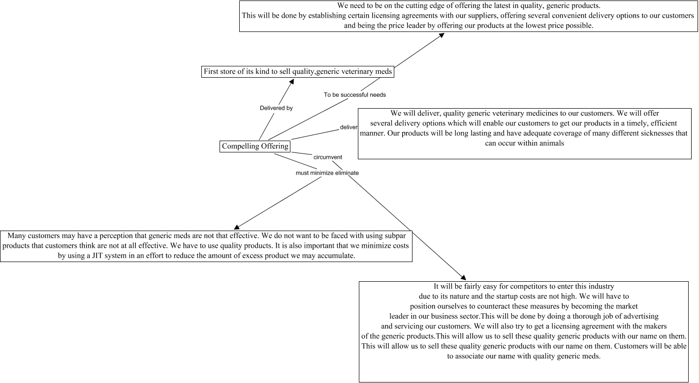 This Concept Map, created with IHMC CmapTools, has information related to: CMap1, Compelling Offering To be successful needs We need to be on the cutting edge of offering the latest in quality, generic products. This will be done by establishing certain licensing agreements with our suppliers, offering several convenient delivery options to our customers and being the price leader by offering our products at the lowest price possible., Compelling Offering delivers We will deliver, quality generic veterinary medicines to our customers. We will offer several delivery options which will enable our customers to get our products in a timely, efficient manner. Our products will be long lasting and have adequate coverage of many different sicknesses that can occur within animals, Compelling Offering Delivered by First store of its kind to sell quality,generic veterinary meds, Compelling Offering circumvent It will be fairly easy for competitors to enter this industry due to its nature and the startup costs are not high. We will have to position ourselves to counteract these measures by becoming the market leader in our business sector.This will be done by doing a thorough job of advertising and servicing our customers. We will also try to get a licensing agreement with the makers of the generic products.This will allow us to sell these quality generic products with our name on them. This will allow us to sell these quality generic products with our name on them. Customers will be able to associate our name with quality generic meds., Compelling Offering must minimize eliminate Many customers may have a perception that generic meds are not that effective. We do not want to be faced with using subpar products that customers think are not at all effective. We have to use quality products. It is also important that we minimize costs by using a JIT system in an effort to reduce the amount of excess product we may accumulate.