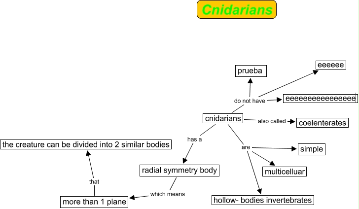 Este Cmap, tiene información relacionada con: Cnidarians, cnidarians has a radial symmetry body, cnidarians do not have eeeeee, radial symmetry body which means more than 1 plane, cnidarians are simple, more than 1 plane that the creature can be divided into 2 similar bodies, cnidarians do not have prueba, cnidarians also called coelenterates, cnidarians are multicelluar, cnidarians do not have eeeeeeeeeeeeeeee, cnidarians are hollow- bodies invertebrates