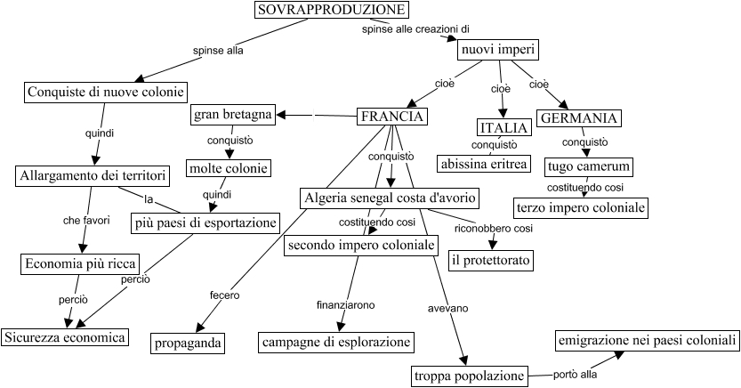 Questa Cmap, creata con IHMC CmapTools, contiene informazioni relative a: Sovrapproduzione, Algeria senegal costa d'avorio costituendo cosi secondo impero coloniale, tugo camerum costituendo cosi terzo impero coloniale, Allargamento dei territori che favorì Economia più ricca, FRANCIA fecero propaganda, molte colonie quindi più paesi di esportazione, troppa popolazione portò alla emigrazione nei paesi coloniali, nuovi imperi cioè FRANCIA, nuovi imperi cioè GERMANIA, ITALIA conquistò abissina eritrea, FRANCIA conquistò Algeria senegal costa d'avorio, nuovi imperi cioè ITALIA, FRANCIA avevano troppa popolazione, Conquiste di nuove colonie quindi Allargamento dei territori, FRANCIA gran bretagna, gran bretagna conquistò molte colonie, SOVRAPPRODUZIONE spinse alle creazioni di nuovi imperi, Allargamento dei territori la più paesi di esportazione, GERMANIA conquistò tugo camerum, FRANCIA finanziarono campagne di esplorazione, Economia più ricca perciò Sicurezza economica