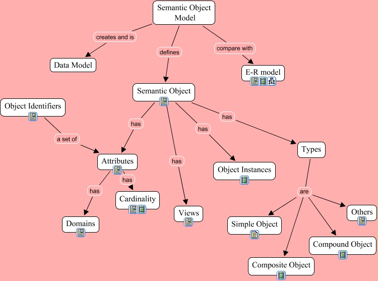 This Concept Map, created with IHMC CmapTools, has information related to: SO model, Object Identifiers a set of Attributes, Semantic Object Model defines Semantic Object, Attributes has Domains, Semantic Object has Views, Semantic Object Model compare with E-R model, Attributes has Cardinality, Types are Compound Object, Types are Simple Object, Types are Composite Object, Semantic Object has Attributes, Semantic Object Model creates and is Data Model, Types are Others, Semantic Object has Types, Semantic Object has Object Instances