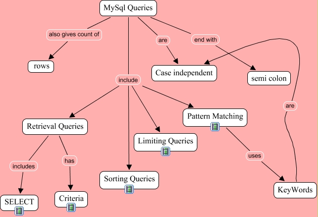 This Concept Map, created with IHMC CmapTools, has information related to: MySql query, MySql Queries include Sorting Queries, MySql Queries also gives count of rows, Retrieval Queries includes SELECT, MySql Queries include Limiting Queries, MySql Queries are Case independent, MySql Queries include Retrieval Queries, KeyWords are Case independent, MySql Queries include Pattern Matching, Pattern Matching uses KeyWords, Retrieval Queries has Criteria, MySql Queries end with semi colon