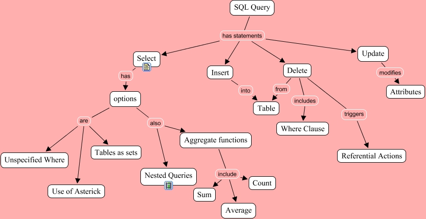This Concept Map, created with IHMC CmapTools, has information related to: SQL Query, options are Unspecified Where, Delete triggers Referential Actions, SQL Query has statements Insert, Update modifies Attributes, SQL Query has statements Update, Aggregate functions include Average, SQL Query has statements Delete, Aggregate functions include Count, Delete includes Where Clause, Select has options, Delete from Table, SQL Query has statements Select, options are Tables as sets, options are Use of Asterick, options also Aggregate functions, options also Nested Queries, Aggregate functions include Sum, Insert into Table