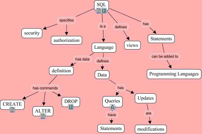 This Concept Map, created with IHMC CmapTools, has information related to: SQL, Language defines Data, SQL specifies security, SQL defines views, definition has commands CREATE, definition has commands ALTER, SQL specifies authorization, Statements can be added to Programming Languages, Queries have Statements, definition has commands DROP, Data has Updates, SQL has Statements, SQL is a Language, Updates are modifications, Language has data definition, Data has Queries
