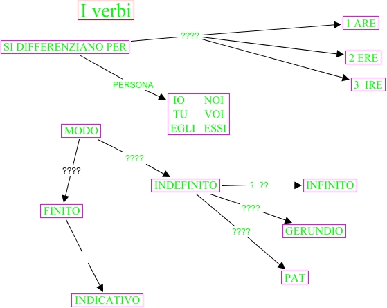 VERBI(2), SI DIFFERENZIANO PER ???? 2 ERE, INDEFINITO ???? GERUNDIO, INDEFINITO ???? PAT, MODO ???? INDEFINITO, FINITO INDICATIVO, MODO ???? FINITO, SI DIFFERENZIANO PER ???? 1 ARE, SI DIFFERENZIANO PER ???? 3 IRE, INDEFINITO ???? INFINITO, SI DIFFERENZIANO PER PERSONA IO NOI TU VOI EGLI ESSI