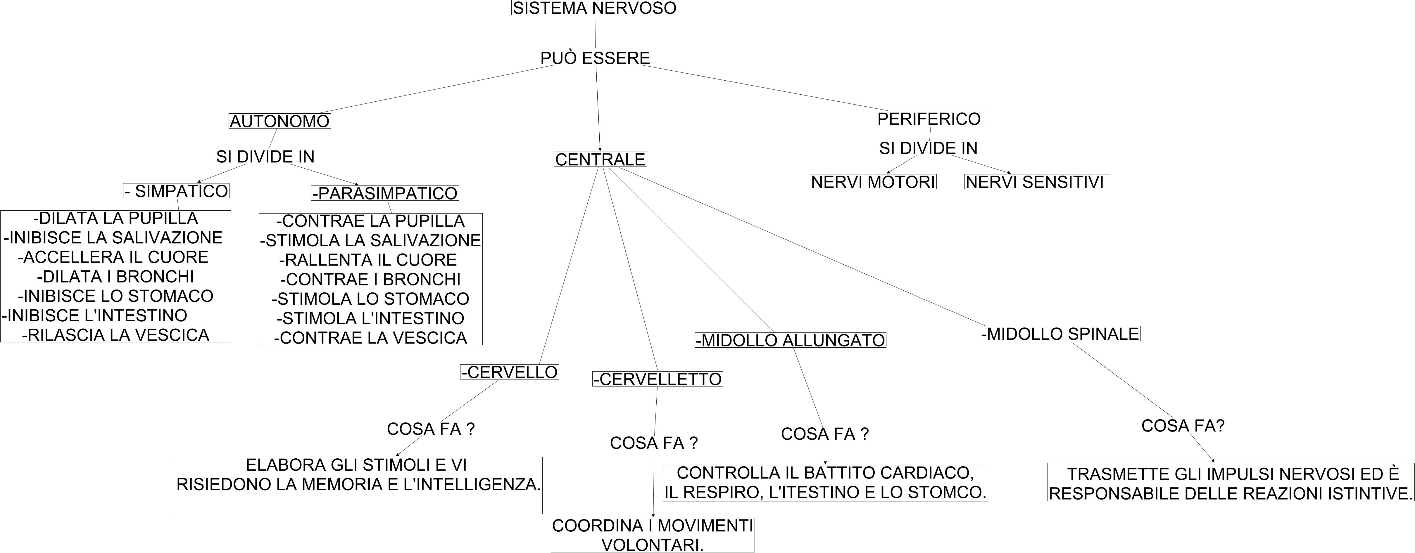 Questa Cmap, creata con IHMC CmapTools, contiene informazioni relative a: sis ner, -CERVELLETTO COSA FA ? COORDINA I MOVIMENTI VOLONTARI., - SIMPATICO ???? -DILATA LA PUPILLA -INIBISCE LA SALIVAZIONE -ACCELLERA IL CUORE -DILATA I BRONCHI -INIBISCE LO STOMACO -INIBISCE L'INTESTINO -RILASCIA LA VESCICA, PERIFERICO SI DIVIDE IN NERVI SENSITIVI, AUTONOMO SI DIVIDE IN -PARASIMPATICO, PERIFERICO PUÒ ESSERE CENTRALE, -MIDOLLO SPINALE COSA FA? TRASMETTE GLI IMPULSI NERVOSI ED È RESPONSABILE DELLE REAZIONI ISTINTIVE., AUTONOMO PUÒ ESSERE CENTRALE, CENTRALE ???? -MIDOLLO ALLUNGATO, PERIFERICO PUÒ ESSERE CENTRALE, AUTONOMO SI DIVIDE IN - SIMPATICO, -PARASIMPATICO ???? -CONTRAE LA PUPILLA -STIMOLA LA SALIVAZIONE -RALLENTA IL CUORE -CONTRAE I BRONCHI -STIMOLA LO STOMACO -STIMOLA L'INTESTINO -CONTRAE LA VESCICA, CENTRALE ???? -MIDOLLO SPINALE, SISTEMA NERVOSO PUÒ ESSERE CENTRALE, -CERVELLO COSA FA ? ELABORA GLI STIMOLI E VI RISIEDONO LA MEMORIA E L'INTELLIGENZA., -MIDOLLO ALLUNGATO COSA FA ? CONTROLLA IL BATTITO CARDIACO, IL RESPIRO, L'ITESTINO E LO STOMCO., CENTRALE ???? -CERVELLETTO, AUTONOMO PUÒ ESSERE CENTRALE, SISTEMA NERVOSO PUÒ ESSERE CENTRALE, CENTRALE ???? -CERVELLO, PERIFERICO SI DIVIDE IN NERVI MOTORI