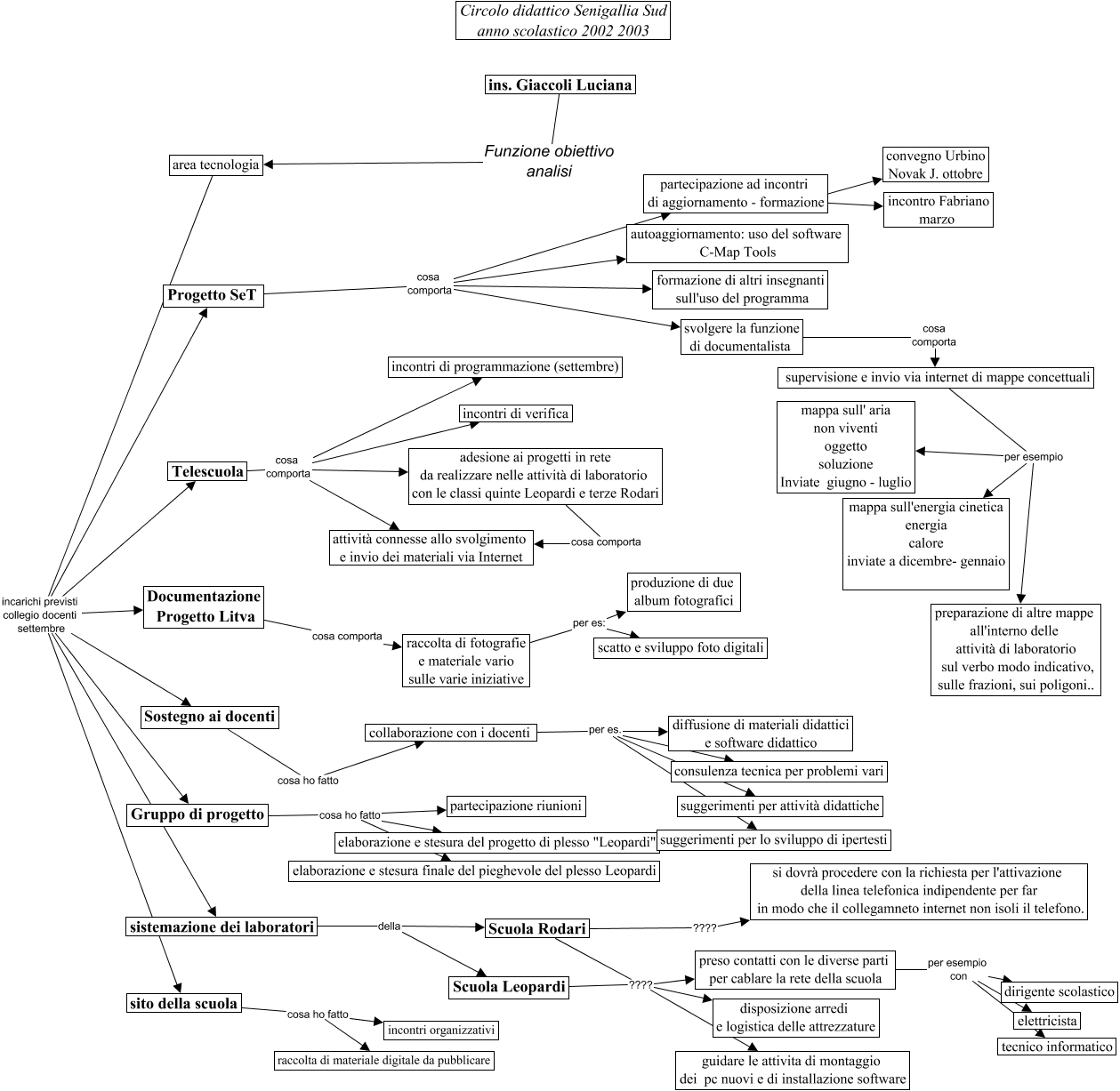 Questa Cmap, creata con IHMC CmapTools, contiene informazioni relative a: funzioneobiettivo, area tecnologia incarichi previsti collegio docenti settembre Sostegno ai docenti, sito della scuola cosa ho fatto incontri organizzativi, Documentazione Progetto Litva cosa comporta raccolta di fotografie e materiale vario sulle varie iniziative, preso contatti con le diverse parti per cablare la rete della scuola per esempio con elettricista, Progetto SeT cosa comporta svolgere la funzione di documentalista, partecipazione ad incontri di aggiornamento - formazione ???? convegno Urbino Novak J. ottobre, sistemazione dei laboratori della Scuola Rodari, Scuola Rodari ???? disposizione arredi e logistica delle attrezzature, Sostegno ai docenti cosa ho fatto collaborazione con i docenti, preso contatti con le diverse parti per cablare la rete della scuola per esempio con tecnico informatico, collaborazione con i docenti per es. consulenza tecnica per problemi vari, area tecnologia incarichi previsti collegio docenti settembre Documentazione Progetto Litva, ins. Giaccoli Luciana Funzione obiettivo analisi area tecnologia, Scuola Rodari ???? guidare le attivita di montaggio dei pc nuovi e di installazione software, supervisione e invio via internet di mappe concettuali per esempio preparazione di altre mappe all'interno delle attività di laboratorio sul verbo modo indicativo, sulle frazioni, sui poligoni.., collaborazione con i docenti per es. suggerimenti per lo sviluppo di ipertesti, Scuola Rodari ???? preso contatti con le diverse parti per cablare la rete della scuola, area tecnologia incarichi previsti collegio docenti settembre sistemazione dei laboratori, Progetto SeT cosa comporta autoaggiornamento: uso del software C-Map Tools, sistemazione dei laboratori della Scuola Leopardi