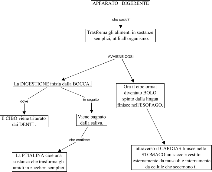 Questa Mappa Concettuale ha informazioni correlate a: APPDIGERE, Trasforma gli alimenti in sostanze semplici, utili all'organismo. AVVIENE COSì La DIGESTIONE inizia dalla BOCCA., La DIGESTIONE inizia dalla BOCCA. dove Il CIBO viene triturato dai DENTI ., APPARATO DIGERENTE che cos'è? Trasforma gli alimenti in sostanze semplici, utili all'organismo., Trasforma gli alimenti in sostanze semplici, utili all'organismo. AVVIENE COSì attraverso il CARDIAS finisce nello STOMACO:un sacco rivestito esternamente da muscoli e internamente da cellule che secernono il, Viene bagnato dalla saliva. che contiene La PTIALINA cioè una sostanza che trasforma gli amidi in zuccheri semplici., La DIGESTIONE inizia dalla BOCCA. in seguito Viene bagnato dalla saliva., Trasforma gli alimenti in sostanze semplici, utili all'organismo. AVVIENE COSì Ora il cibo ormai diventato BOLO spinto dalla lingua finisce nell'ESOFAGO.