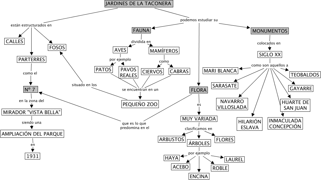 This Concept Map, created with IHMC CmapTools, has information related to: jardinesTaconera, SIGLO XX como son aquellos a MARI BLANCA, ÁRBOLES por ejemplo HAYA, SIGLO XX como son aquellos a GAYARRE, SIGLO XX como son aquellos a TEOBALDOS, MONUMENTOS colocados en SIGLO XX, JARDINES DE LA TACONERA están estructurados en FOSOS, JARDINES DE LA TACONERA están estructurados en PARTERRES, AVES por ejemplo PATOS, FLORA que es lo que predomina en el Nº 7, SIGLO XX como son aquellos a HUARTE DE SAN JUAN, MAMÍFEROS como CABRAS, SIGLO XX como son aquellos a INMACULADA CONCEPCIÓN, SIGLO XX como son aquellos a HILARIÓN ESLAVA, SIGLO XX como son aquellos a NAVARRO VILLOSLADA, FAUNA dividida en MAMÍFEROS, JARDINES DE LA TACONERA están estructurados en CALLES, FAUNA dividida en AVES, CIERVOS se encuentran en un PEQUEÑO ZOO, MUY VARIADA clasificamos en ÁRBOLES, FLORA es MUY VARIADA