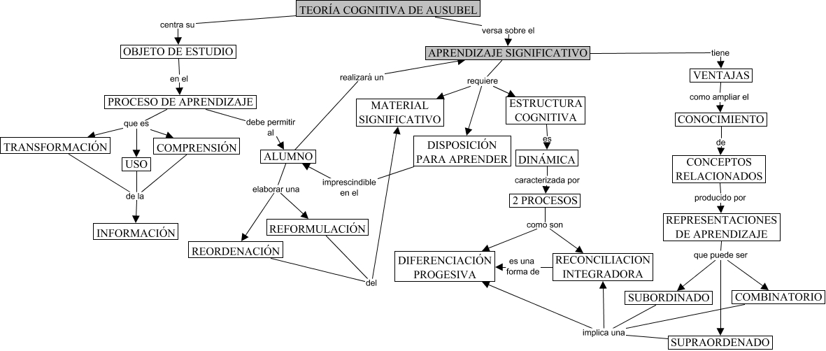Este Cmap, tiene información relacionada con: Ausubel, VENTAJAS como ampliar el CONOCIMIENTO, 2 PROCESOS como son DIFERENCIACIÓN PROGESIVA, REORDENACIÓN del MATERIAL SIGNIFICATIVO, SUBORDINADO implica una DIFERENCIACIÓN PROGESIVA, ALUMNO elaborar una REORDENACIÓN, COMBINATORIO implica una DIFERENCIACIÓN PROGESIVA, PROCESO DE APRENDIZAJE que es TRANSFORMACIÓN, PROCESO DE APRENDIZAJE que es USO, OBJETO DE ESTUDIO en el PROCESO DE APRENDIZAJE, DISPOSICIÓN PARA APRENDER imprescindible en el ALUMNO, CONOCIMIENTO de CONCEPTOS RELACIONADOS, SUBORDINADO implica una RECONCILIACION INTEGRADORA, CONCEPTOS RELACIONADOS producido por REPRESENTACIONES DE APRENDIZAJE, ALUMNO elaborar una REFORMULACIÓN, USO de la INFORMACIÓN, TEORÍA COGNITIVA DE AUSUBEL versa sobre el APRENDIZAJE SIGNIFICATIVO, APRENDIZAJE SIGNIFICATIVO requiere DISPOSICIÓN PARA APRENDER, COMPRENSIÓN de la INFORMACIÓN, PROCESO DE APRENDIZAJE que es COMPRENSIÓN, APRENDIZAJE SIGNIFICATIVO requiere MATERIAL SIGNIFICATIVO