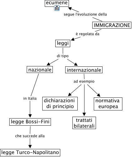 This Concept Map, created with IHMC CmapTools, has information related to: immigrazione, internazionale ad esempio normativa europea, nazionale in Italia legge Bossi-Fini, legge Bossi-Fini che succede alla legge Turco-Napolitano, IMMIGRAZIONE segue l'evoluzione della ecumene, internazionale ad esempio dichiarazioni di principio, IMMIGRAZIONE è regolata da leggi, leggi di tipo internazionale, internazionale ad esempio trattati bilaterali, leggi di tipo nazionale