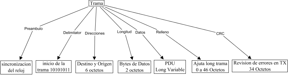 Este Cmap, tiene información relacionada con: TramaEthernet, Trama CRC Revision de errores en TX 34 Octetos, Trama Relleno Ajuta long trama 0 a 46 Octetos, Trama Datos PDU Long Variable, Trama Direcciones Destino y Origen 6 octetos, Trama Longitud Bytes de Datos 2 octetos, Trama Delimitator inicio de la trama 10101011, Trama Preambulo sincronizacion del reloj