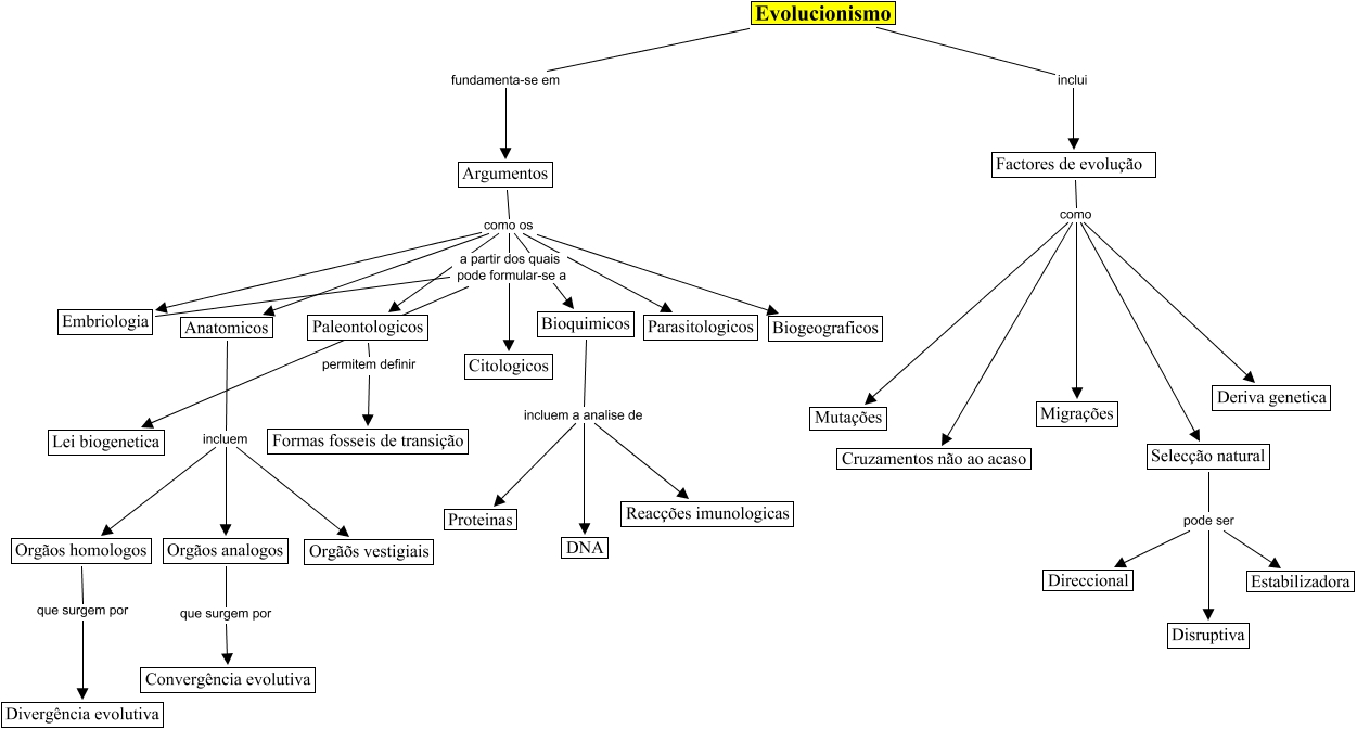 Este Cmap, tiene información relacionada con: evolucionismo, Argumentos como os Embriologia, Bioquimicos incluem a analise de Proteinas, Argumentos como os Biogeograficos, Factores de evolução como Cruzamentos não ao acaso, Argumentos como os Parasitologicos, Paleontologicos permitem definir Formas fosseis de transição, Embriologia a partir dos quais pode formular-se a Lei biogenetica, Anatomicos incluem Orgãos homologos, Orgãos analogos que surgem por Convergência evolutiva, Factores de evolução como Migrações, Selecção natural pode ser Direccional, Factores de evolução como Mutações, Factores de evolução como Deriva genetica, Argumentos como os Paleontologicos, Anatomicos incluem Orgãos analogos, Argumentos como os Citologicos, Selecção natural pode ser Disruptiva, Anatomicos incluem Orgãõs vestigiais, Argumentos como os Anatomicos, Orgãos homologos que surgem por Divergência evolutiva