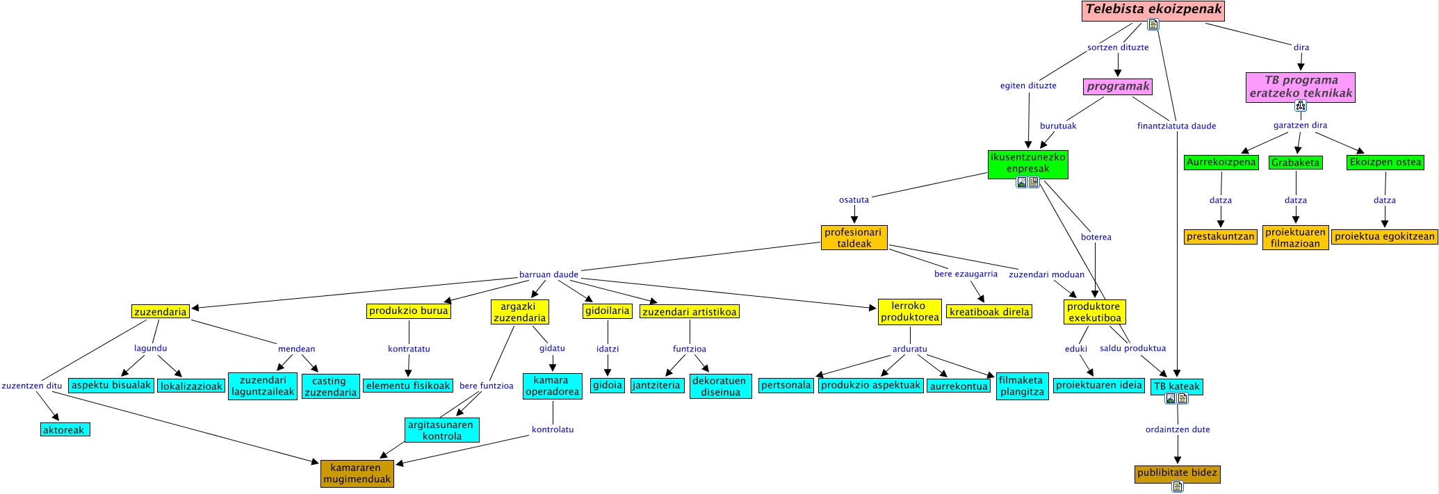 This Concept Map, created with IHMC CmapTools, has information related to: Telebista ekoizpenak, TB programa eratzeko teknikak garatzen dira Ekoizpen ostea, zuzendari artistikoa funtzioa jantziteria, produktore exekutiboa saldu produktua TB kateak, kamara operadorea kontrolatu kamararen mugimenduak, ikusentzunezko enpresak saldu produktua TB kateak, ikusentzunezko enpresak boterea produktore exekutiboa, zuzendaria lagundu lokalizazioak, produkzio burua kontratatu elementu fisikoak, Aurrekoizpena datza prestakuntzan, lerroko produktorea arduratu pertsonala, gidoilaria idatzi gidoia, zuzendari artistikoa funtzioa dekoratuen diseinua, TB kateak ordaintzen dute publibitate bidez, lerroko produktorea arduratu produkzio aspektuak, Telebista ekoizpenak dira TB programa eratzeko teknikak, argazki zuzendaria gidatu kamara operadorea, Telebista ekoizpenak egiten dituzte ikusentzunezko enpresak, profesionari taldeak barruan daude argazki zuzendaria, zuzendaria mendean zuzendari laguntzaileak, lerroko produktorea arduratu filmaketa plangitza