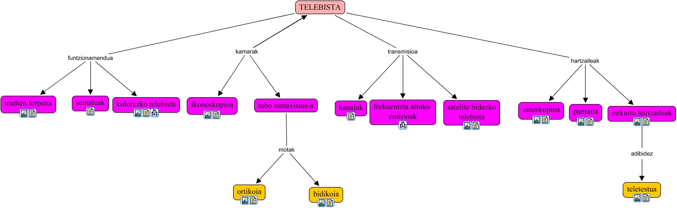 This Concept Map, created with IHMC CmapTools, has information related to: telebista, TELEBISTA funtzionamendua seinaleak, TELEBISTA kamarak ikonoskopioa, TELEBISTA hartzaileak pantaila, zirkuito hartzaileak adibidez teletestua, TELEBISTA transmisioa kanalak, TELEBISTA hartzaileak zineskopioa, TELEBISTA transmisioa frekuentzia altuko emisioak, TELEBISTA kamarak tubo tomavistas-a, TELEBISTA hartzaileak zirkuito hartzaileak, TELEBISTA funtzionamendua irudien lorpena, tubo tomavistas-a motak bidikoia, TELEBISTA transmisioa satelite bidezko telebista, TELEBISTA funtzionamendua kolorezko telebista, tubo tomavistas-a motak ortikoia