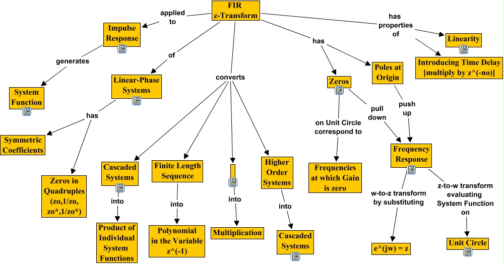 Este Cmap, tiene información relacionada con: FIR_Z_Transform, FIR z-Transform of Linear-Phase Systems, Finite Length Sequence into Polynomial in the Variable z^(-1), FIR z-Transform converts Higher Order Systems, Frequency Response z-to-w transform evaluating System Function on Unit Circle, FIR z-Transform applied to Impulse Response, Cascaded Systems into Product of Individual System Functions, Poles at Origin push up Frequency Response, Frequency Response w-to-z transform by substituting e^(jw) = z, Higher Order Systems into Cascaded Systems, Linear-Phase Systems has Symmetric Coefficients, into Multiplication, Zeros pull down Frequency Response, FIR z-Transform has Poles at Origin, FIR z-Transform converts Cascaded Systems, FIR z-Transform has properties of Introducing Time Delay [multiply by z^(-no)], Linear-Phase Systems has Zeros in Quadruples (zo,1/zo, zo*,1/zo*), FIR z-Transform converts, FIR z-Transform has Zeros, FIR z-Transform converts Finite Length Sequence, Impulse Response generates System Function