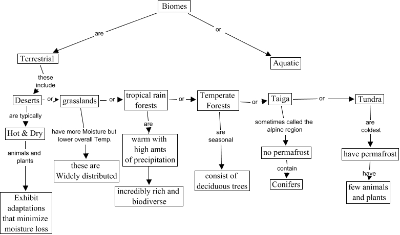 biome2k3b, have permafrost have few animals and plants, Taiga or Tundra, Hot & Dry animals and plants Exhibit adaptations that minimize moisture loss, Biomes or Aquatic, Taiga sometimes called the alpine region no permafrost, Deserts or grasslands, Temperate Forests are seasonal consist of deciduous trees, grasslands or tropical rain forests, Tundra are coldest have permafrost, Biomes are Terrestrial