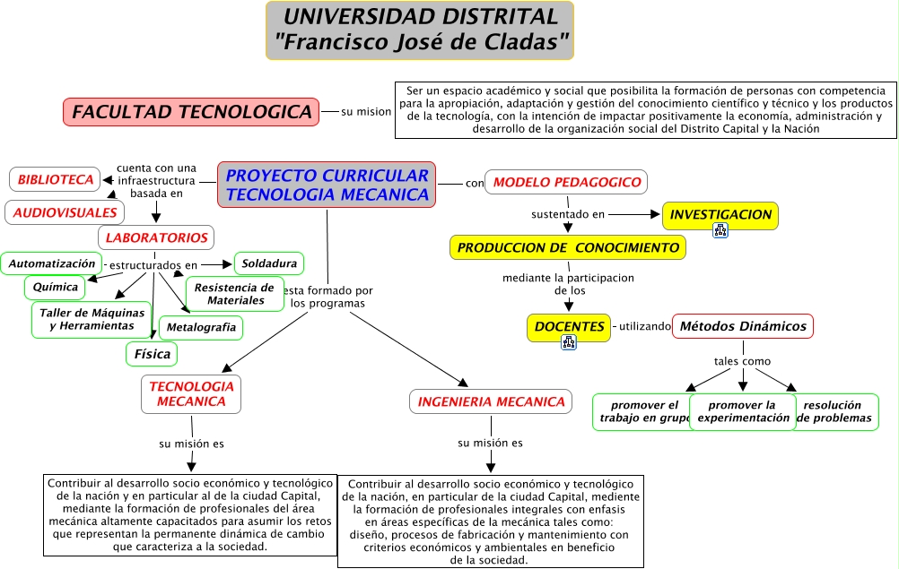 This Concept Map, created with IHMC CmapTools, has information related to: Mecanica, LABORATORIOS estructurados en Soldadura, Métodos Dinámicos tales como promover la experimentación, PROYECTO CURRICULAR TECNOLOGIA MECANICA esta formado por los programas TECNOLOGIA MECANICA, LABORATORIOS estructurados en Metalografia, INGENIERIA MECANICA su misión es Contribuir al desarrollo socio económico y tecnológico de la nación, en particular de la ciudad Capital, mediente la formación de profesionales integrales con enfasis en áreas específicas de la mecánica tales como: diseño, procesos de fabricación y mantenimiento con criterios económicos y ambientales en beneficio de la sociedad., PROYECTO CURRICULAR TECNOLOGIA MECANICA con MODELO PEDAGOGICO, FACULTAD TECNOLOGICA su mision es Ser un espacio académico y social que posibilita la formación de personas con competencia para la apropiación, adaptación y gestión del conocimiento científico y técnico y los productos de la tecnología, con la intención de impactar positivamente la economía, administración y desarrollo de la organización social del Distrito Capital y la Nación, Métodos Dinámicos tales como resolución de problemas, PROYECTO CURRICULAR TECNOLOGIA MECANICA esta formado por los programas INGENIERIA MECANICA, MODELO PEDAGOGICO sustentado en PRODUCCION DE CONOCIMIENTO, Métodos Dinámicos tales como promover el trabajo en grupo, PRODUCCION DE CONOCIMIENTO mediante la participacion de los DOCENTES, PROYECTO CURRICULAR TECNOLOGIA MECANICA cuenta con una infraestructura basada en BIBLIOTECA, LABORATORIOS estructurados en Resistencia de Materiales, LABORATORIOS estructurados en Automatización, PROYECTO CURRICULAR TECNOLOGIA MECANICA cuenta con una infraestructura basada en LABORATORIOS, MODELO PEDAGOGICO sustentado en INVESTIGACION, LABORATORIOS estructurados en Física, TECNOLOGIA MECANICA su misión es Contribuir al desarrollo socio económico y tecnológico de la nación y en particular al de la ciudad Capital, mediante la formación de profesionales del área mecánica altamente capacitados para asumir los retos que representan la permanente dinámica de cambio que caracteriza a la sociedad., LABORATORIOS estructurados en Taller de Máquinas y Herramientas