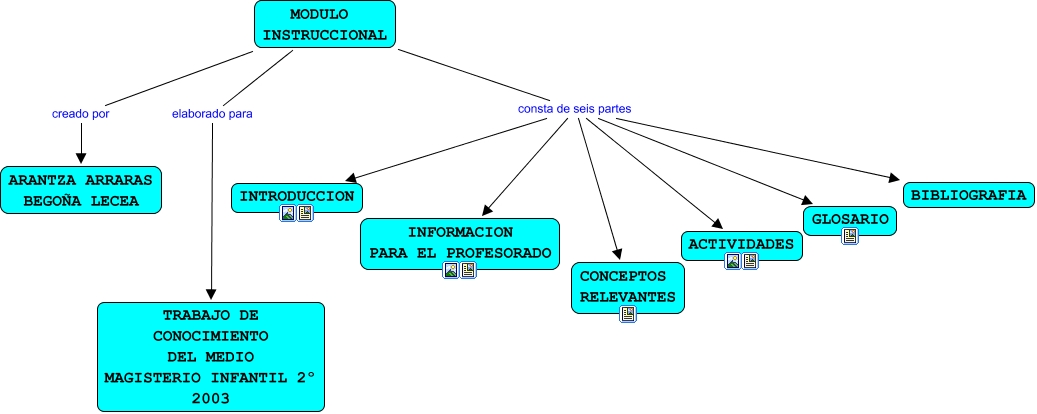 This Concept Map, created with IHMC CmapTools, has information related to: moduloinstruccional, MODULO INSTRUCCIONAL creado por ARANTZA ARRARAS BEGOÑA LECEA, MODULO INSTRUCCIONAL elaborado para TRABAJO DE CONOCIMIENTO DEL MEDIO MAGISTERIO INFANTIL 2º 2003, MODULO INSTRUCCIONAL consta de seis partes ACTIVIDADES, MODULO INSTRUCCIONAL consta de seis partes INFORMACION PARA EL PROFESORADO, MODULO INSTRUCCIONAL consta de seis partes GLOSARIO, MODULO INSTRUCCIONAL consta de seis partes CONCEPTOS RELEVANTES, MODULO INSTRUCCIONAL consta de seis partes INTRODUCCION, MODULO INSTRUCCIONAL consta de seis partes BIBLIOGRAFIA
