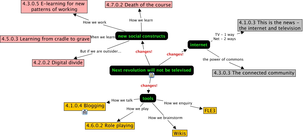 This Concept Map, created with IHMC CmapTools, has information related to: Michel - module 4 - context, Next revolution will not be televised changes! new social constructs, tools How we play 4.6.0.2 Role playing, internet TV - 1 way Net - 2 ways 4.1.0.3 This is the news - the internet and television, new social constructs When we learn 4.5.0.3 Learning from cradle to grave, internet the power of commons 4.3.0.3 The connected community, new social constructs How we work 4.3.0.5 E-learning for new patterns of working, new social constructs But if we are outsider... 4.2.0.2 Digital divide, tools How we brainstorm Wikis, tools How we enquiry FLE3, Next revolution will not be televised changes! tools, tools How we talk 4.1.0.4 Blogging, new social constructs How we learn 4.7.0.2 Death of the course, Next revolution will not be televised changes! internet
