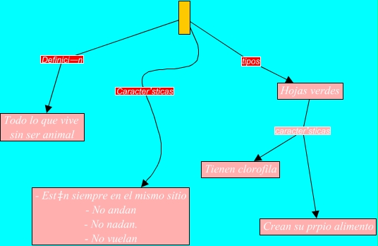 Este Cmap, tiene información relacionada con: plantas, Hojas verdes caracter’sticas Crean su prpio alimento, Caracter’sticas - Est‡n siempre en el mismo sitio - No andan - No nadan. - No vuelan, Definici—n Todo lo que vive sin ser animal, tipos Hojas verdes, Hojas verdes caracter’sticas Tienen clorofila
