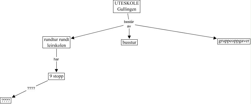 This Concept Map, created with IHMC CmapTools, has information related to: Gullingen01, UTESKOLE Gullingen består av busstur, UTESKOLE Gullingen består av rundtur rundt leirskolen, UTESKOLE Gullingen består av gruppeoppgaver, rundtur rundt leirskolen har 9 stopp, 9 stopp ???? ????