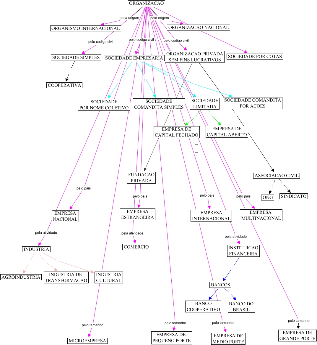 This Concept Map, created with IHMC CmapTools, has information related to: ORGANIZACAO, SOCIEDADE EMPRESARIA SOCIEDADE LIMITADA, SOCIEDADE EMPRESARIA SOCIEDADE POR NOME COLETIVO, ORGANIZACAO pela atividade INDUSTRIA, ORGANIZACAO pelo pais EMPRESA INTERNACIONAL, ORGANIZACAO pelo codigo civil SOCIEDADE EMPRESARIA, SOCIEDADE SIMPLES COOPERATIVA, ORGANIZACAO pelo pais EMPRESA ESTRANGEIRA, BANCOS BANCO DO BRASIL, SOCIEDADE EMPRESARIA SOCIEDADE COMANDITA POR ACOES, ASSOCIACAO CIVIL ONG, INDUSTRIA INDUSTRIA CULTURAL, ORGANIZACAO PRIVADA SEM FINS LUCRATIVOS ???? FUNDACAO PRIVADA, ORGANIZACAO pelo codigo civil ORGANIZACAO PRIVADA SEM FINS LUCRATIVOS, BANCOS BANCO COOPERATIVO, ORGANIZACAO PRIVADA SEM FINS LUCRATIVOS ASSOCIACAO CIVIL, ORGANIZACAO pela atividade INSTITUICAO FINANCEIRA, ORGANIZACAO pela origem ORGANIZACAO NACIONAL, INSTITUICAO FINANCEIRA BANCOS, ORGANIZACAO pelo tamanho EMPRESA DE GRANDE PORTE, ORGANIZACAO pela atividade COMERCIO