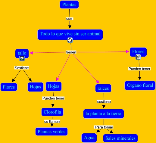 Este Cmap, tiene información relacionada con: Plantas, tallo Sostiene Flores, Todo lo que vive sin ser animal tienen Hojas, Flores Pueden tener Organo floral, tallo Sostiene Hojas, la planta a la tierra Para tomar Agua, Plantas son Todo lo que vive sin ser animal, Todo lo que vive sin ser animal tienen Flores, Todo lo que vive sin ser animal tienen raices, raices sostiene la planta a la tierra, la planta a la tierra Para tomar Sales minerales, Clorofila se llaman Plantas verdes, Todo lo que vive sin ser animal tienen tallo, Hojas Pueden tener Clorofila