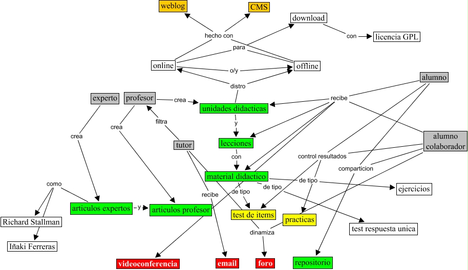 This Concept Map, created with IHMC CmapTools, has information related to: zopelana_1_28_2003_1136, tutor filtra profesor, experto crea articulos expertos, online hecho con CMS, online para download, material didactico de tipo test respuesta unica, alumno colaborador recibe videoconferencia, alumno recibe unidades didacticas, offline hecho con weblog, online o/y offline, material didactico de tipo ejercicios, alumno colaborador control resultados practicas, articulos expertos como Richard Stallman, articulos expertos y articulos profesor, unidades didacticas distro online, alumno recibe videoconferencia, alumno control resultados test de items, alumno colaborador dinamiza foro, alumno colaborador recibe material didactico, alumno control resultados practicas, tutor dinamiza foro