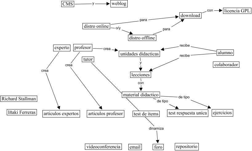 This Concept Map, created with IHMC CmapTools, has information related to: zopelana_1_28_2003_1040, experto crea articulos expertos, alumno recibe unidades didacticas, material didactico de tipo test respuesta unica, tutor dinamiza foro, unidades didacticas y lecciones, distro online o/y distro offline, download con licencia GPL, distro online para download, material didactico de tipo ejercicios, lecciones con material didactico, profesor crea unidades didacticas, alumno recibe lecciones, distro offline para download, CMS y weblog, profesor crea articulos profesor