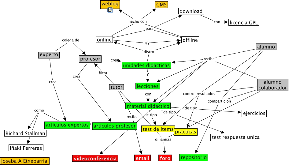 This Concept Map, created with IHMC CmapTools, has information related to: zopelana_1_28_2003_1138, offline para download, online hecho con weblog, tutor recibe email, alumno recibe material didactico, alumno recibe videoconferencia, offline hecho con CMS, alumno colaborador recibe videoconferencia, online para download, articulos expertos como Iñaki Ferreras, alumno colaborador comparticion repositorio, unidades didacticas distro offline, alumno colaborador recibe material didactico, material didactico de tipo test respuesta unica, experto colega de profesor, unidades didacticas y lecciones, experto crea articulos expertos, alumno colaborador recibe lecciones, online hecho con CMS, tutor filtra profesor, alumno control resultados test de items