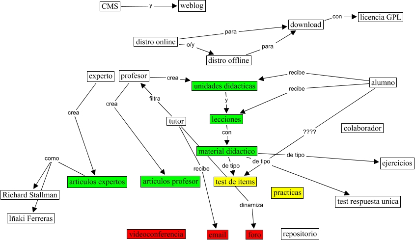 This Concept Map, created with IHMC CmapTools, has information related to: zopelana_1_28_2003_110, tutor recibe email, material didactico de tipo ejercicios, alumno ???? test de items, CMS y weblog, alumno recibe lecciones, distro online para download, lecciones con material didactico, distro online o/y distro offline, profesor crea unidades didacticas, material didactico de tipo test respuesta unica, material didactico de tipo test de items, articulos expertos como Richard Stallman, unidades didacticas y lecciones, experto crea articulos expertos, download con licencia GPL, distro offline para download, articulos expertos como Iñaki Ferreras, tutor filtra profesor, alumno recibe unidades didacticas, profesor crea articulos profesor