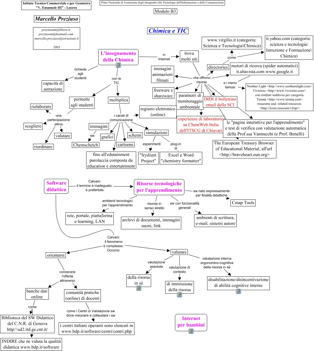 Questa Cmap, creata con IHMC CmapTools, contiene informazioni relative a: Mod. 3 Home, orientarsi conoscere l'offerta attraverso comunità pratiche (online) di docenti, trova molti siti che offrono risorse motori di ricerca (spider automatici) it.altavista.com www.google.it, moltiplica i canali di comunicazione grafici, trova molti siti che offrono risorse immagini animazioni filmati, moltiplica i canali di comunicazione registro elettronico (online), directories come it.yahoo.com (categoria: scienza e tecnologia\ Istruzione e Formazione\ Chimica), trova molti siti che offrono risorse directories, Risorse tecnologiche per l'apprendimento risorse in senso stretto archivi di documenti, immagini suoni, link, Risorse tecnologiche per l'apprendimento ambienti tecnologici per l'apprendimento rete, portale, piattaforma e-learning, LAN, comunità pratiche (online) di docenti come i Centri di Valutazione sw dove visionare e collaudare i sw i centri italiani operanti sono elencati in www.bdp.it/software/centri/centri.php, L'insegnamento della Chimica in Internet trova molti siti, banche dati online come Biblioteca del SW Didattico del C.N.R. di Genova http:\\sd2.itd.ge.cnr.it/, moltiplica i canali di comunicazione immagini, Software didattico Calvani: il fenomeno è complesso. Occorre: orientarsi, moltiplica i canali di comunicazione fino all'edutainment parolaccia composta da education e entertainment, Software didattico Calvani: il fenomeno è complesso. Occorre: valutare, trova molti siti che offrono risorse The European Treasury Browser of Educational Material, all'url <http://braveheart.eun.org>, valutare valutazione di contesto di immissione della risorsa, moltiplica i canali di comunicazione cartoons, motori di ricerca (spider automatici) it.altavista.com www.google.it e i meno famosi Norther Light <http://www.northernlight.com> Vivisimo <http://www.vivisimo.com> con risultati suddivisi per categoria. Teoma <http://www.teoma.com> museums and -related resources <http://icom.museum/vlmp/>