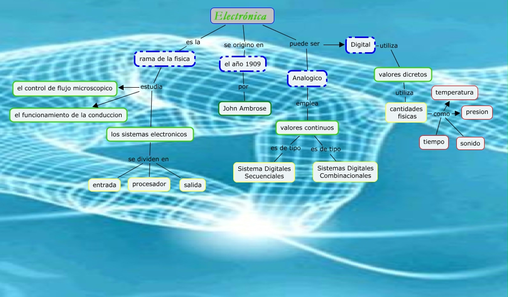 Este Cmap, tiene información relacionada con: electronica, los sistemas electronicos se dividen en salida, valores continuos es de tipo Sistema Digitales Secuenciales, Electrónica puede ser Digital, el año 1909 por John Ambrose, cantidades fisicas como tiempo, rama de la fisica estudia el funcionamiento de la conduccion, cantidades fisicas como sonido, Analogico emplea valores continuos, valores dicretos utiliza cantidades fisicas, rama de la fisica estudia el control de flujo microscopico, los sistemas electronicos se dividen en procesador, Digital utiliza valores dicretos, cantidades fisicas como temperatura, Electrónica es la rama de la fisica, los sistemas electronicos se dividen en entrada, Electrónica se origino en el año 1909, Electrónica puede ser Analogico, valores continuos es de tipo Sistemas Digitales Combinacionales, cantidades fisicas como presion, rama de la fisica estudia los sistemas electronicos