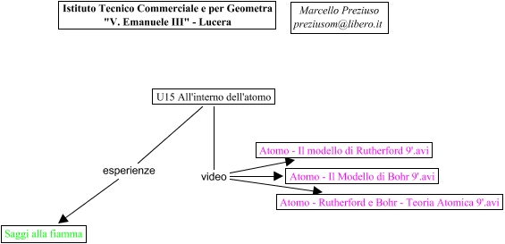 This Concept Map, created with IHMC CmapTools, has information related to: U15 All'interno dell'atomo, U15 All'interno dell'atomo video Atomo - Rutherford e Bohr - Teoria Atomica 9'.avi, U15 All'interno dell'atomo video Atomo - Il Modello di Bohr 9'.avi, U15 All'interno dell'atomo esperienze Saggi alla fiamma, U15 All'interno dell'atomo video Atomo - Il modello di Rutherford 9'.avi