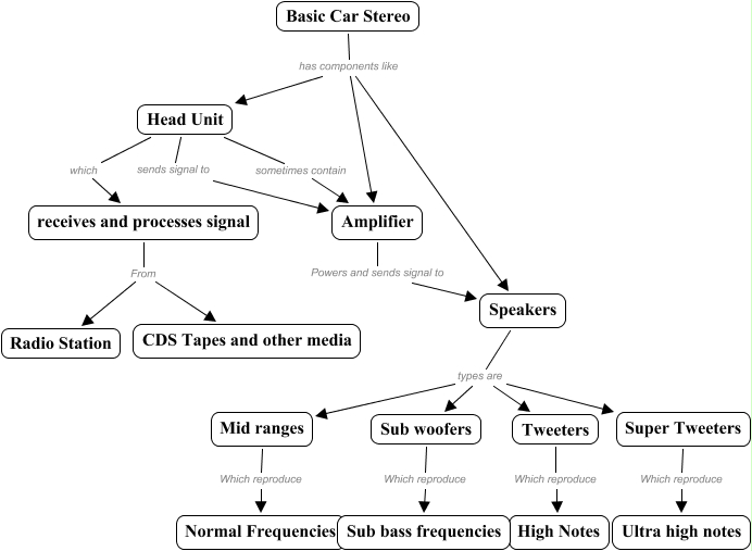 This Concept Map, created with IHMC CmapTools, has information related to: Hoochie, Super Tweeters Which reproduce Ultra high notes, Basic Car Stereo has components like Speakers, Speakers types are Super Tweeters, receives and processes signal From CDS Tapes and other media, Speakers types are Tweeters, Basic Car Stereo has components like Head Unit, Head Unit sometimes contain Amplifier, Speakers types are Mid ranges, Head Unit which receives and processes signal, Basic Car Stereo has components like Amplifier, Tweeters Which reproduce High Notes, Speakers types are Sub woofers, Head Unit sends signal to Amplifier, Amplifier Powers and sends signal to Speakers, Sub woofers Which reproduce Sub bass frequencies, receives and processes signal From Radio Station, Mid ranges Which reproduce Normal Frequencies