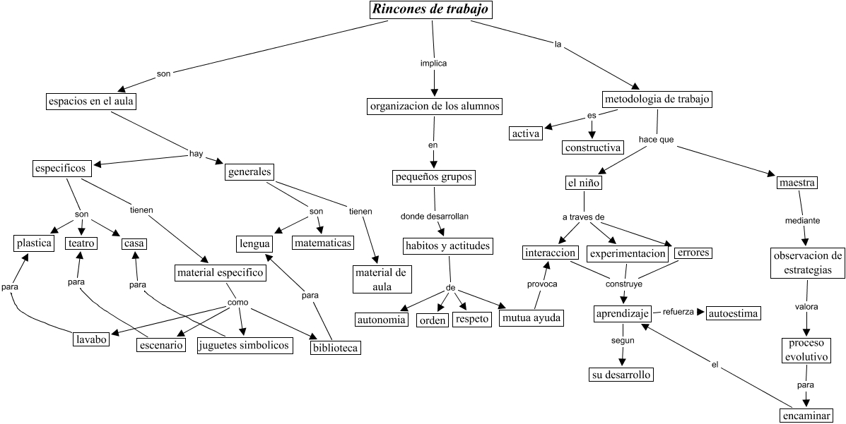 Este Cmap, tiene información relacionada con: rincones de trabajo, habitos y actitudes de respeto, el niño a traves de interaccion, espacios en el aula hay especificos, escenario para teatro, organizacion de los alumnos en pequeños grupos, material especifico como escenario, aprendizaje segun su desarrollo, juguetes simbolicos para casa, errores construye aprendizaje, habitos y actitudes de mutua ayuda, especificos son plastica, metodologia de trabajo es activa, el niño a traves de errores, proceso evolutivo para encaminar, habitos y actitudes de orden, lavabo para plastica, espacios en el aula hay generales, el niño a traves de experimentacion, experimentacion construye aprendizaje, especificos son teatro