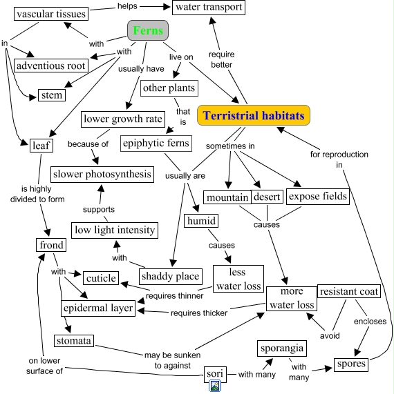This Concept Map, created with IHMC CmapTools, has information related to: Ferns, Ferns live on other plants, Terristrial habitats require better water transport, Ferns live on Terristrial habitats, stomata may be sunken to against more water loss, Terristrial habitats sometimes in desert, vascular tissues in adventious root, sori on lower surface of frond, Terristrial habitats usually are humid, Ferns with vascular tissues, humid causes less water loss, frond with stomata, epiphytic ferns usually are humid, Ferns with adventious root, leaf is highly divided to form frond, vascular tissues helps water transport, spores for reproduction in Terristrial habitats, Terristrial habitats sometimes in expose fields, shaddy place with low light intensity, frond with cuticle, epiphytic ferns usually are shaddy place