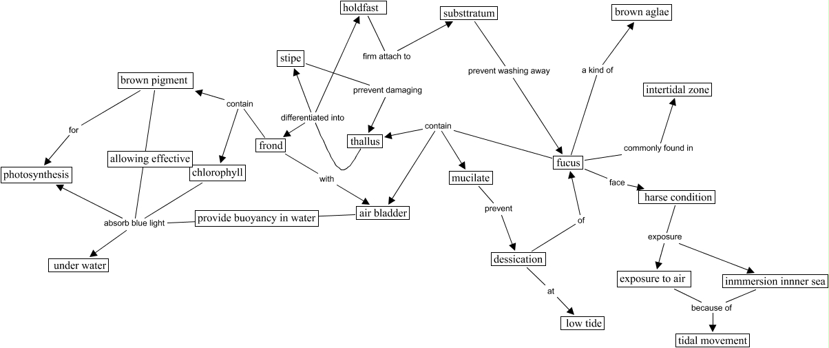 This Concept Map, created with IHMC CmapTools, has information related to: Fred, frond with air bladder, thallus differentiated into stipe, thallus differentiated into holdfast, brown pigment for photosynthesis, dessication of fucus, frond contain brown pigment, inmmersion innner sea because of tidal movement, fucus a kind of brown aglae, fucus commonly found in intertidal zone, substtratum prevent washing away fucus, thallus differentiated into frond, air bladder absorb blue light photosynthesis, harse condition exposure inmmersion innner sea, air bladder absorb blue light under water, fucus contain mucilate, dessication at low tide, fucus face harse condition, exposure to air because of tidal movement, stipe prrevent damaging thallus, chlorophyll absorb blue light under water