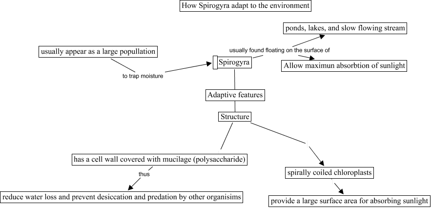 This Concept Map, created with IHMC CmapTools, has information related to: YHK, Structure spirally coiled chloroplasts, usually appear as a large popullation to trap moisture, has a cell wall covered with mucilage (polysaccharide) thus reduce water loss and prevent desiccation and predation by other organisims, Structure has a cell wall covered with mucilage (polysaccharide), Spirogyra usually found floating on the surface of Allow maximun absorbtion of sunlight, spirally coiled chloroplasts provide a large surface area for absorbing sunlight, Spirogyra usually found floating on the surface of ponds, lakes, and slow flowing stream, Spirogyra Structure