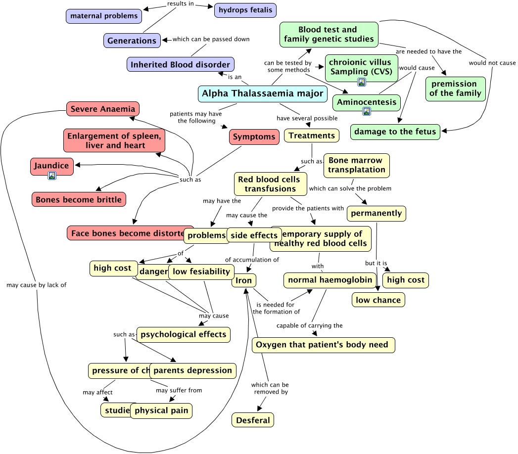 This Concept Map, created with IHMC CmapTools, has information related to: First Problem Cmap, Symptoms such as Jaundice, psychological effects such as parents depression, problems of high cost, Red blood cells transfusions may have the problems, normal haemoglobin capable of carrying the Oxygen that patient's body need, Inherited Blood disorder which can be passed down Generations, psychological effects such as pressure of child, pressure of child may affect studies, high cost may cause psychological effects, Blood test and family genetic studies would not cause damage to the fetus, Alpha Thalassaemia major can be tested by some methods chroionic villus Sampling (CVS), Iron which can be removed by Desferal, Blood test and family genetic studies are needed to have the premission of the family, side effects of accumulation of Iron, Red blood cells transfusions may cause the side effects, Bone marrow transplatation which can solve the problem permanently, permanently but it is low chance, Red blood cells transfusions provide the patients with temporary supply of healthy red blood cells, problems of danger, Alpha Thalassaemia major can be tested by some methods Blood test and family genetic studies