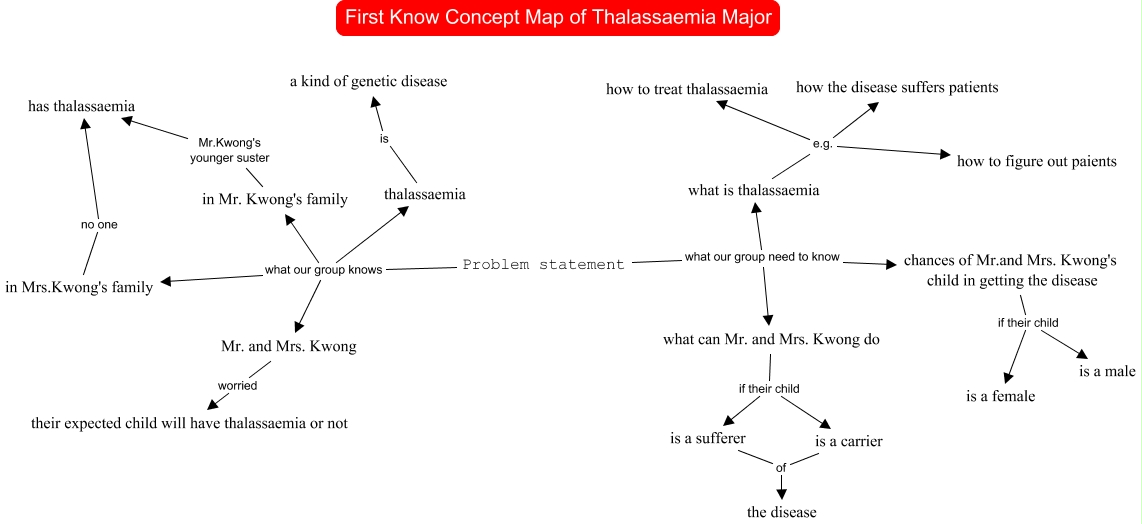 This Concept Map, created with IHMC CmapTools, has information related to: First Know Concept Map of Thalassaemia Major, is a carrier of the disease, Problem statement what our group need to know what is thalassaemia, Problem statement what our group knows thalassaemia, what is thalassaemia e.g. how the disease suffers patients, Problem statement what our group need to know chances of Mr.and Mrs. Kwong's child in getting the disease, what is thalassaemia e.g. how to treat thalassaemia, chances of Mr.and Mrs. Kwong's child in getting the disease if their child is a male, chances of Mr.and Mrs. Kwong's child in getting the disease if their child is a female, Problem statement what our group knows in Mrs.Kwong's family, is a sufferer of the disease, in Mr. Kwong's family Mr.Kwong's younger suster has thalassaemia, what can Mr. and Mrs. Kwong do if their child is a carrier, Problem statement what our group knows in Mr. Kwong's family, what is thalassaemia e.g. how to figure out paients, Problem statement what our group need to know what can Mr. and Mrs. Kwong do, Problem statement what our group knows Mr. and Mrs. Kwong, in Mrs.Kwong's family no one has thalassaemia, what can Mr. and Mrs. Kwong do if their child is a sufferer, Mr. and Mrs. Kwong worried their expected child will have thalassaemia or not, thalassaemia is a kind of genetic disease