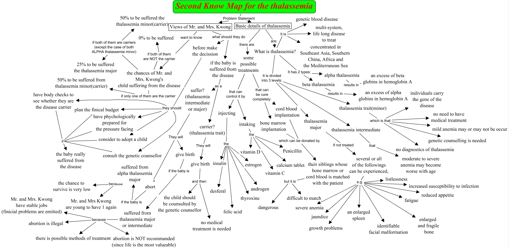 This Concept Map, created with IHMC CmapTools, has information related to: 2nd Know Map of Gp2, Views of Mr. and Mrs. Kwong what should they do before make the decission, What is thalassemia? It is divided into 3 levels: thalassemia trait(minor), suffered from thalassemia major or intermediate because abortion is illegal, What is thalassemia? It is multi-system, life long disease to treat, What is thalassemia? It is divided into 3 levels: thalassemia major, several or all of the followings can be experienced, e.g. growth problems, if the baby is suffered from the disease as a suffer? (thalassemia intermediate or major), several or all of the followings can be experienced, e.g. reduced appetite, consult the genetic counsellor if the baby really suffered from the disease, if the baby is suffered from the disease as a carrier? (thalassemia trait), several or all of the followings can be experienced, e.g. jaundice, intaking the Penicillin, before make the decission they should have phychologically prepared for the pressure facing, the chances of Mr. and Mrs. Kwong's child suffering from the disease if both of them are carriers (except the case of both ALPHA thalassemia minor) 50% to be suffered the thalassemia minor(carrier), the chances of Mr. and Mrs. Kwong's child suffering from the disease if both of them are NOT the carrier 0% to be suffered, their siblings whose bone marrow or cord blood is matched with the patient but it is difficult to match, What is thalassemia? It is concentrated in Southeast Asia, Southern China, Africa and the Mediterranean Sea, Basic details of thalassemia are: What is thalassemia?, cord blood implantation which can be donated by their siblings whose bone marrow or cord blood is matched with the patient, intaking the vitamin C