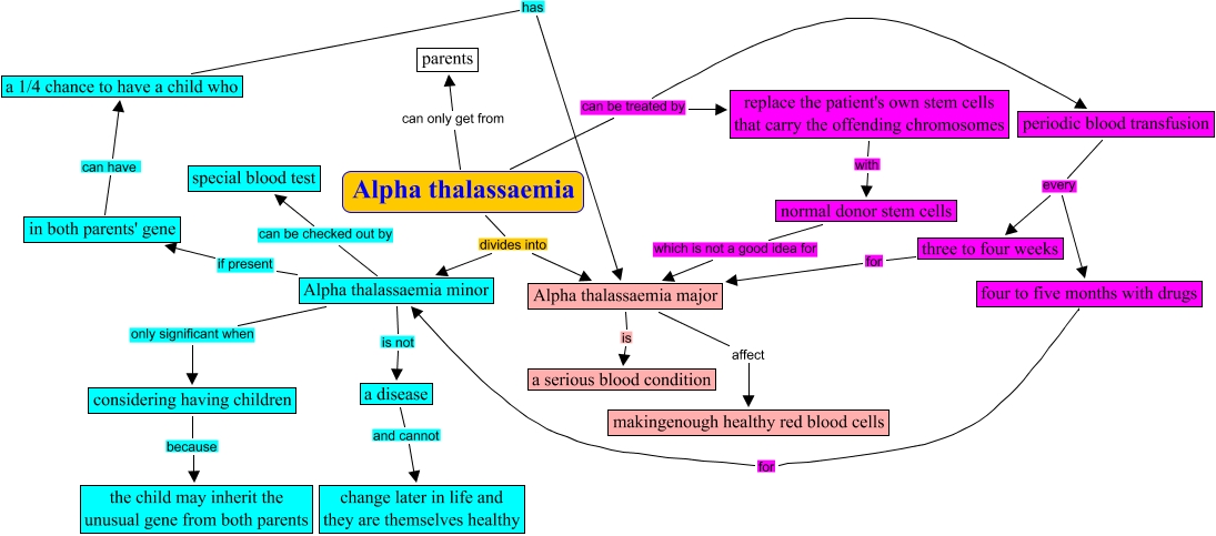 This Concept Map, created with IHMC CmapTools, has information related to: PrivateMap, a disease and cannot change later in life and they are themselves healthy, a 1/4 chance to have a child who has Alpha thalassaemia major, Alpha thalassaemia major is a serious blood condition, Alpha thalassaemia minor only significant when considering having children, considering having children because the child may inherit the unusual gene from both parents, replace the patient's own stem cells that carry the offending chromosomes with normal donor stem cells, Alpha thalassaemia divides into Alpha thalassaemia minor, Alpha thalassaemia can be treated by periodic blood transfusion, three to four weeks for Alpha thalassaemia major, periodic blood transfusion every four to five months with drugs, Alpha thalassaemia divides into Alpha thalassaemia major, Alpha thalassaemia can be treated by replace the patient's own stem cells that carry the offending chromosomes, Alpha thalassaemia minor can be checked out by special blood test, Alpha thalassaemia major affect makingenough healthy red blood cells, normal donor stem cells which is not a good idea for Alpha thalassaemia major, four to five months with drugs for Alpha thalassaemia minor, Alpha thalassaemia minor if present in both parents' gene, Alpha thalassaemia can only get from parents, Alpha thalassaemia minor is not a disease, periodic blood transfusion every three to four weeks